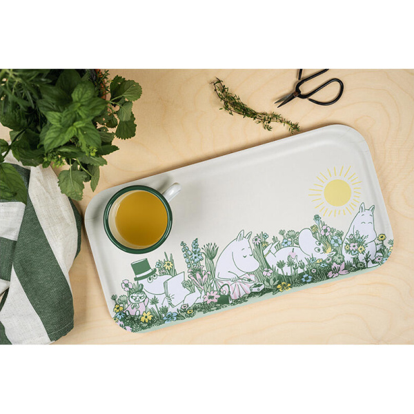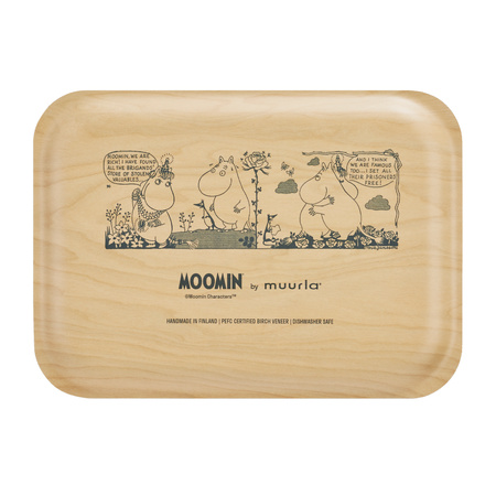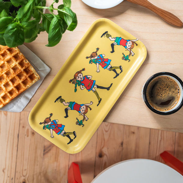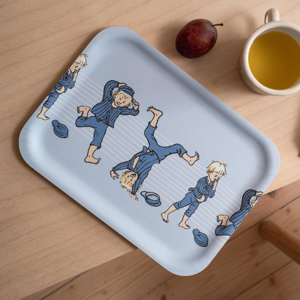 Serveringsbrett med motiver fra Pippi Langstrømpe, Mummidalen og Emil i Lønneberget.