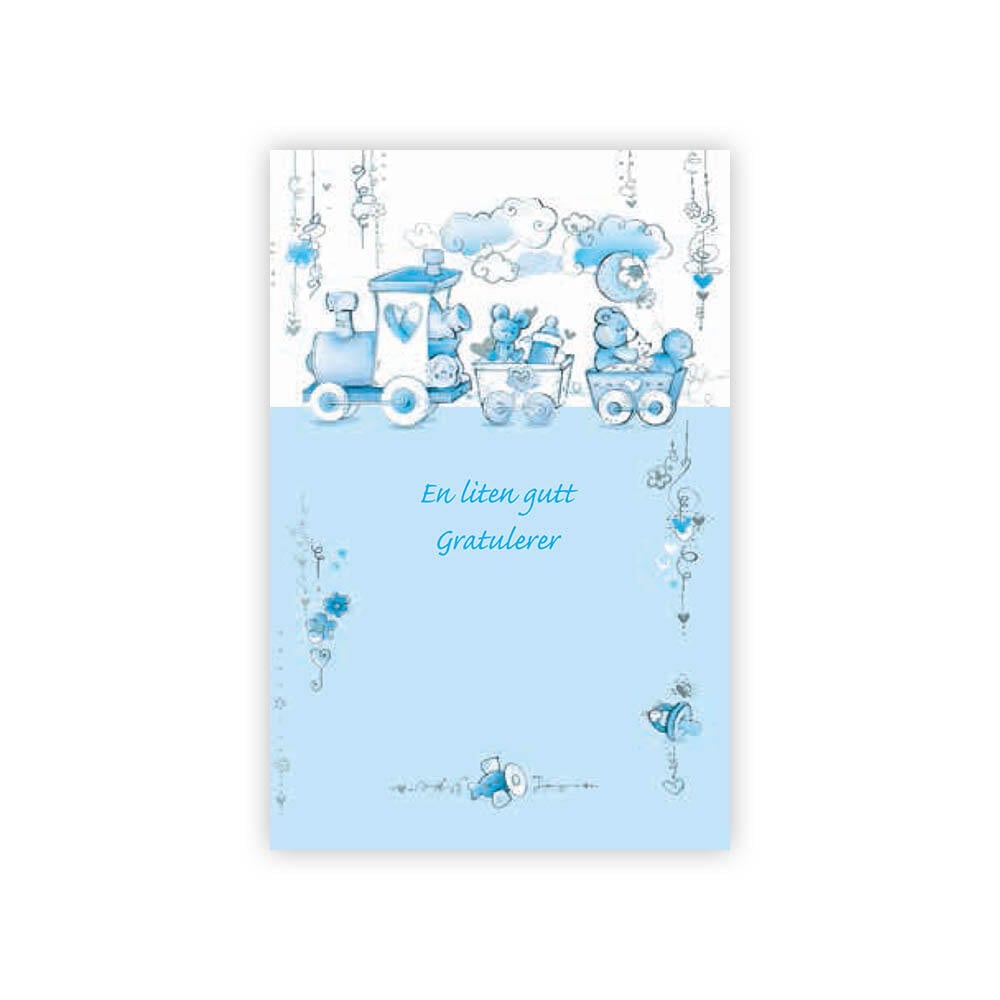 Dobbelt fødselskort med konvolutt. Perfekt til gaver eller blomsterbuketter. Tekst: En liten gutt. Gratulerer. Str: 7 x 10,5 cm.