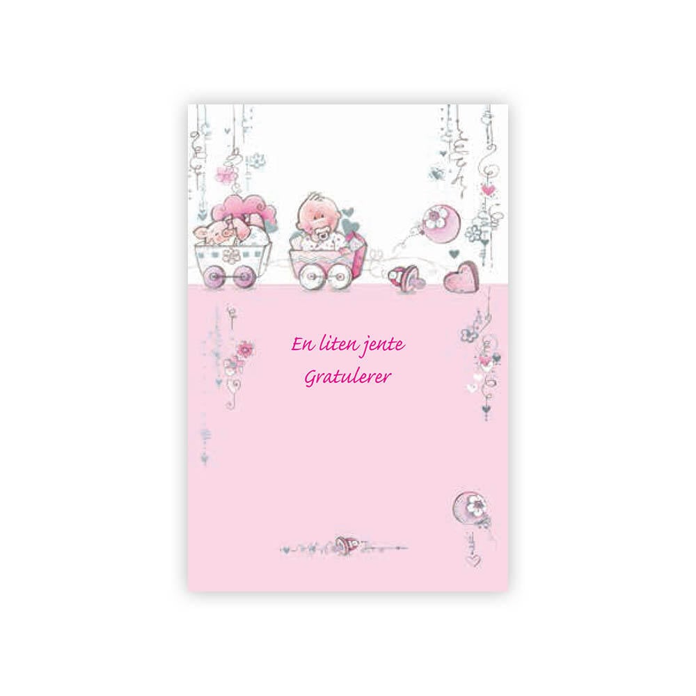 Dobbelt fødselskort med konvolutt. Perfekt til gaver eller blomsterbuketter. Tekst: En liten jente. Gratulerer. Str: 7 x 10,5 cm.