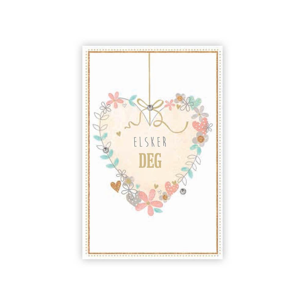 Dobbelt gratulasjonskort med konvolutt. Perfekt til gaver eller blomsterbuketter. Tekst: Elsker deg.