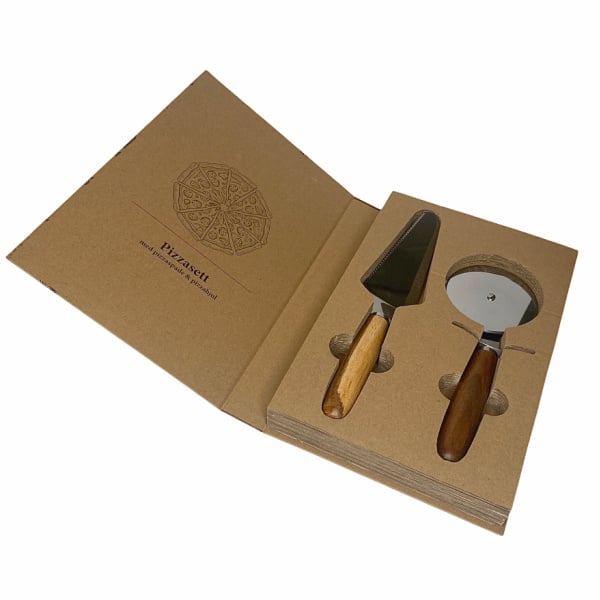 En gaveeske som inneholder et flott pizzahjul og en pizzaspade.