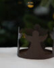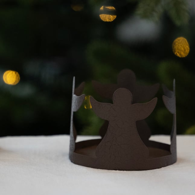 Lysholder i brunt metall til kubbelys med motiv av engler.