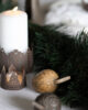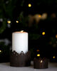Lysholder i brunt metall til kubbelys med motiv av juleby.